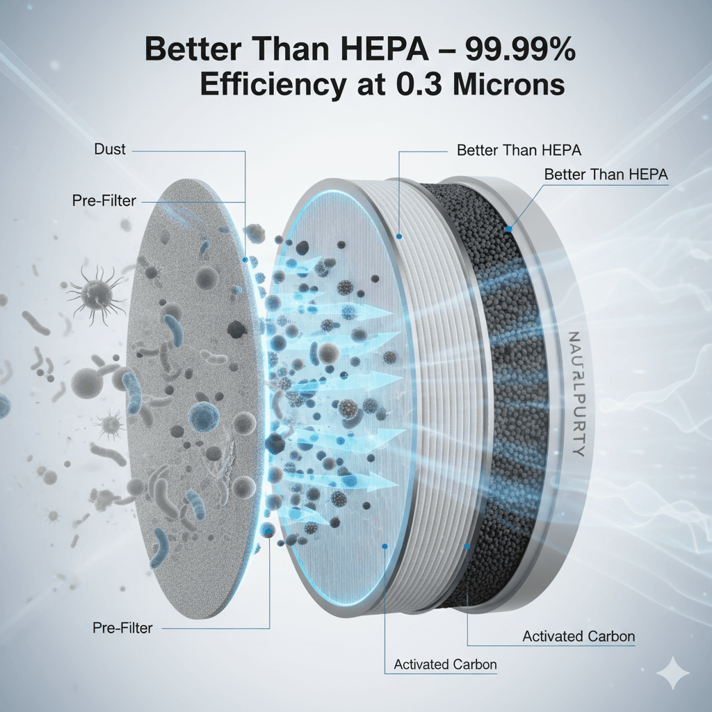 Medical-grade filtration: Captures 99.99% of airborne particles as small as 0.3 microns.